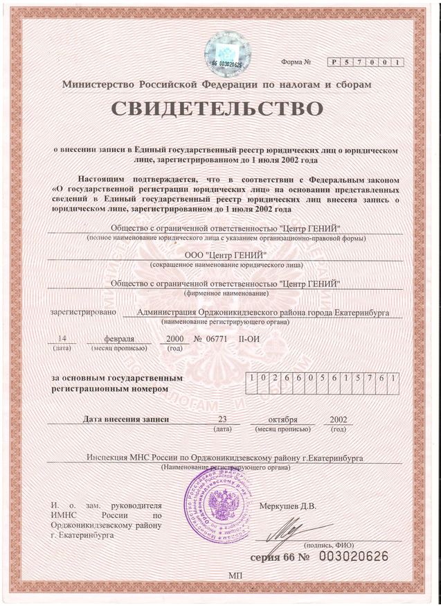 Свидетельство регистрации юридического лица ОРГН (ознакомиться)